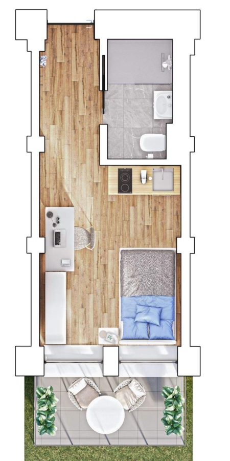 The apartment is fully furnished according to the motto "Move in and feel at home." The modern built-in kitchen comes equipped with all essential kitchen utensils, dishes, and a coffee machine — so you're well provided for from day one. The cozy living area includes a comfortable sleeping space and a desk, perfect for working or studying. A television is also available. The warm rent is charged as a fixed monthly rate and includes all operating and utility costs, electricity, and Wi-Fi. There is no annual utility reconciliation.