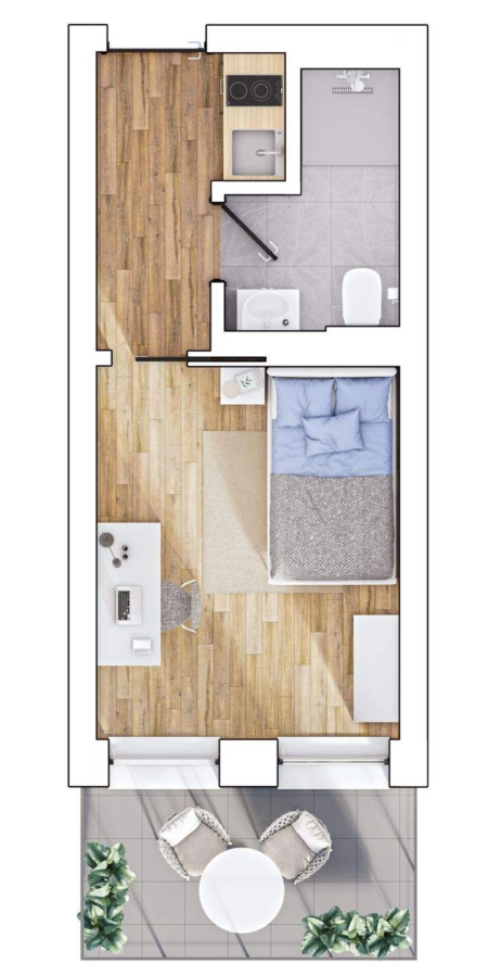 Das Apartment ist nach dem Motto „Einziehen und wohlfühlen“ vollständig ausgestattet. Die moderne Einbauküche bietet Ihnen alle notwendigen Küchenutensilien, Geschirr sowie eine Kaffeemaschine – so sind Sie vom ersten Tag an bestens versorgt. Der gemütliche Wohnbereich verfügt über einen komfortablen Schlafbereich und einen Schreibtisch, der sich ideal zum Arbeiten oder Lernen eignet. Ein Fernseher steht ebenfalls zur Verfügung. Die Warmmiete wird als monatliche Pauschale berechnet und beinhaltet sämtliche Betriebs- und Nebenkosten, Strom sowie WLAN. Eine jährliche Abrechnung entfällt.